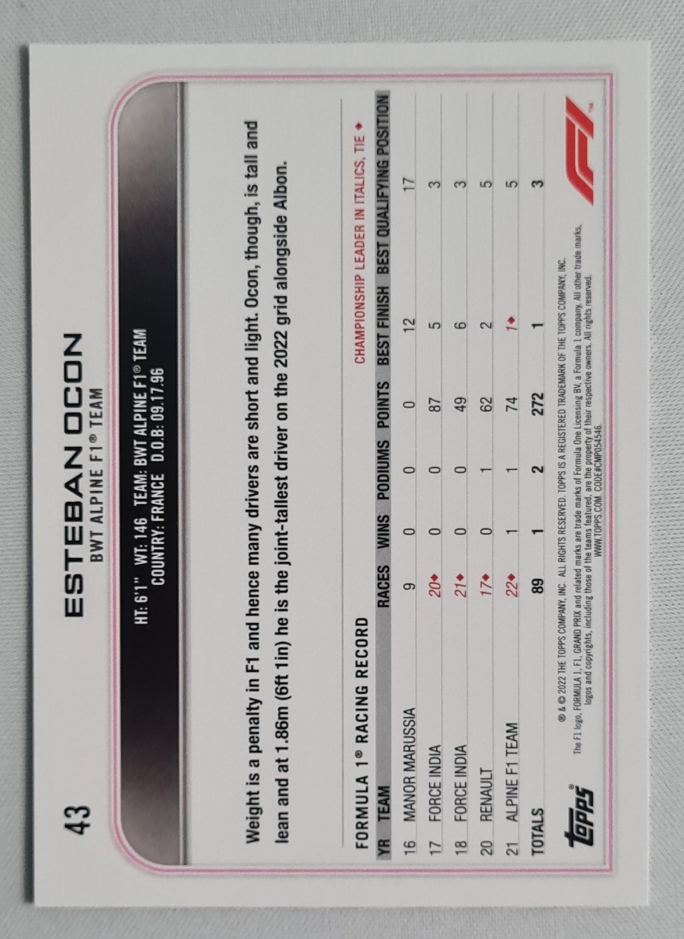 2022 Topps F-1 BWT Alpine Formula One Team #43 checker