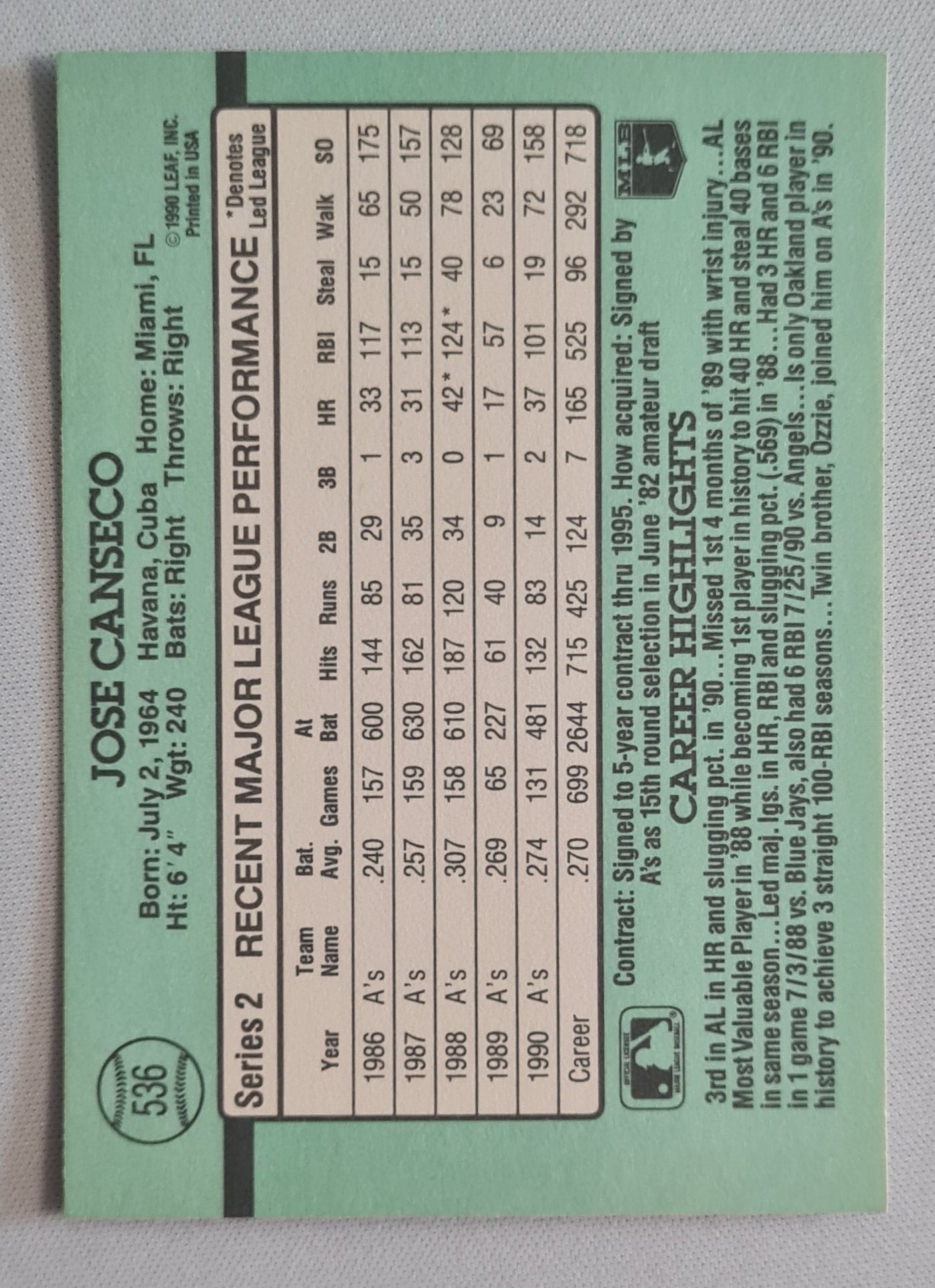 Jose Canseco - 1990 Donruss Leaf MLB Baseball Oakland Athletics #536
