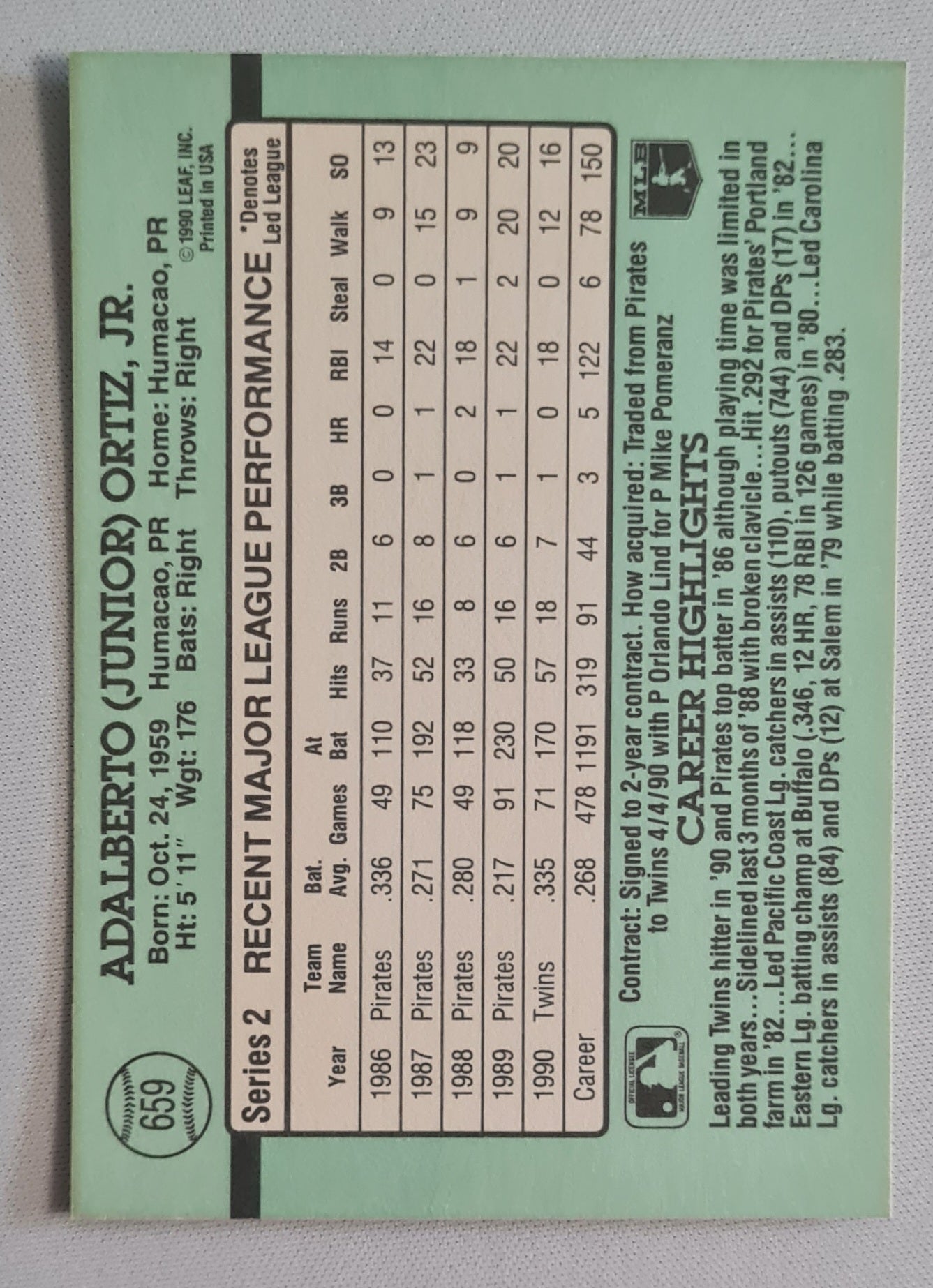 Junior Ortiz - 1990 Donruss Leaf MLB Baseball Minnesota Twins #659