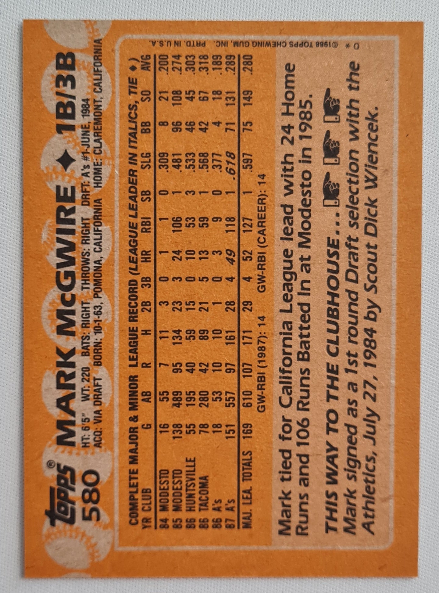 Mark McGwire - 1988 Topps Tiffany #580 Oakland A's