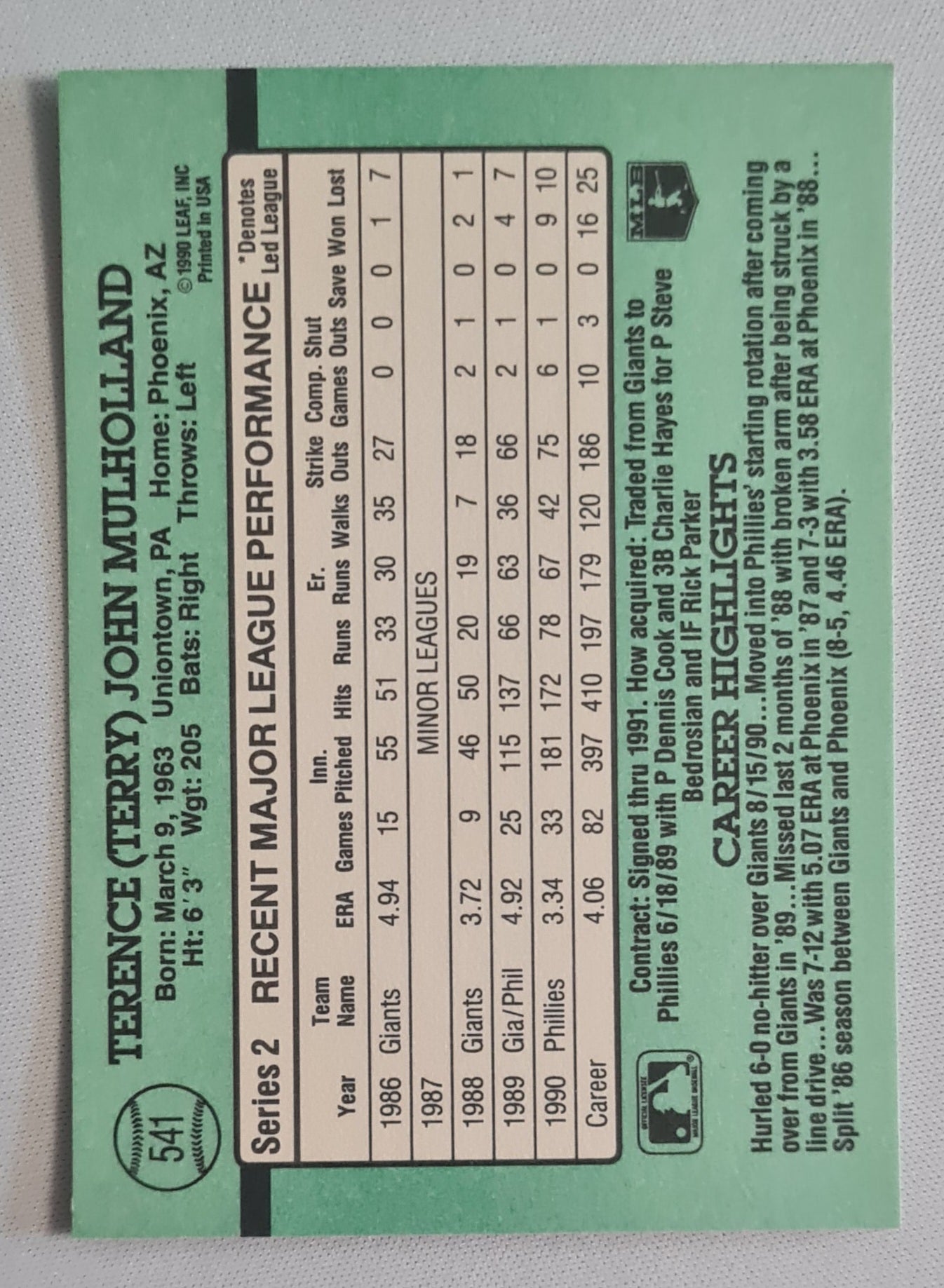 Terence Mulholland - 1990 Donruss Leaf MLB Baseball Philadelphia Phillies #541